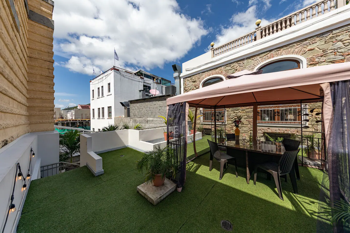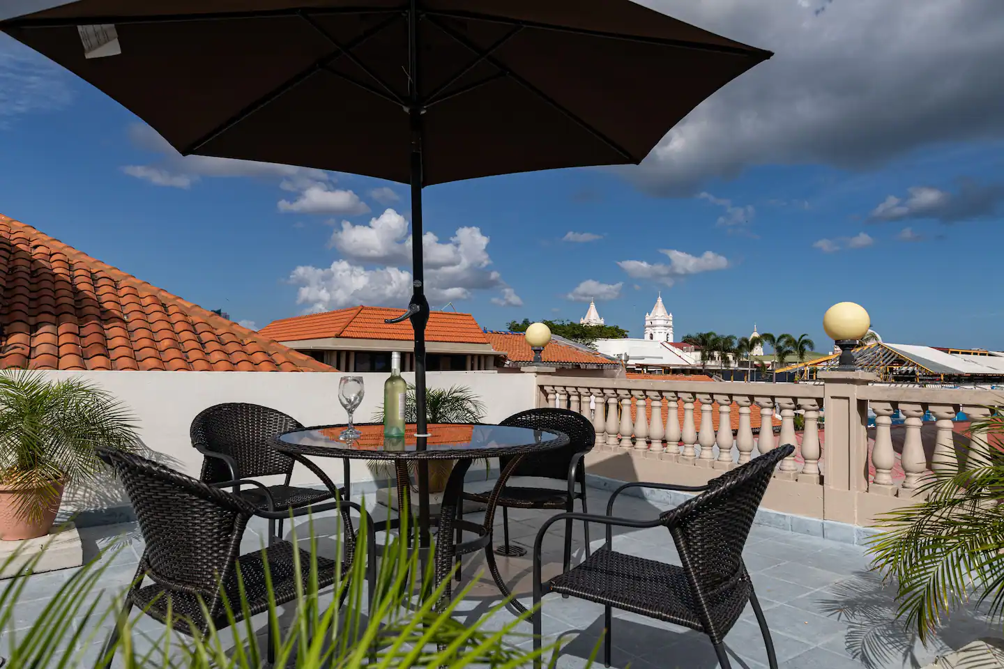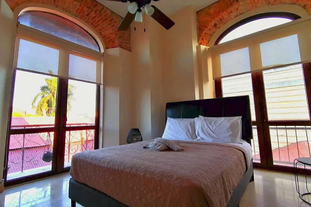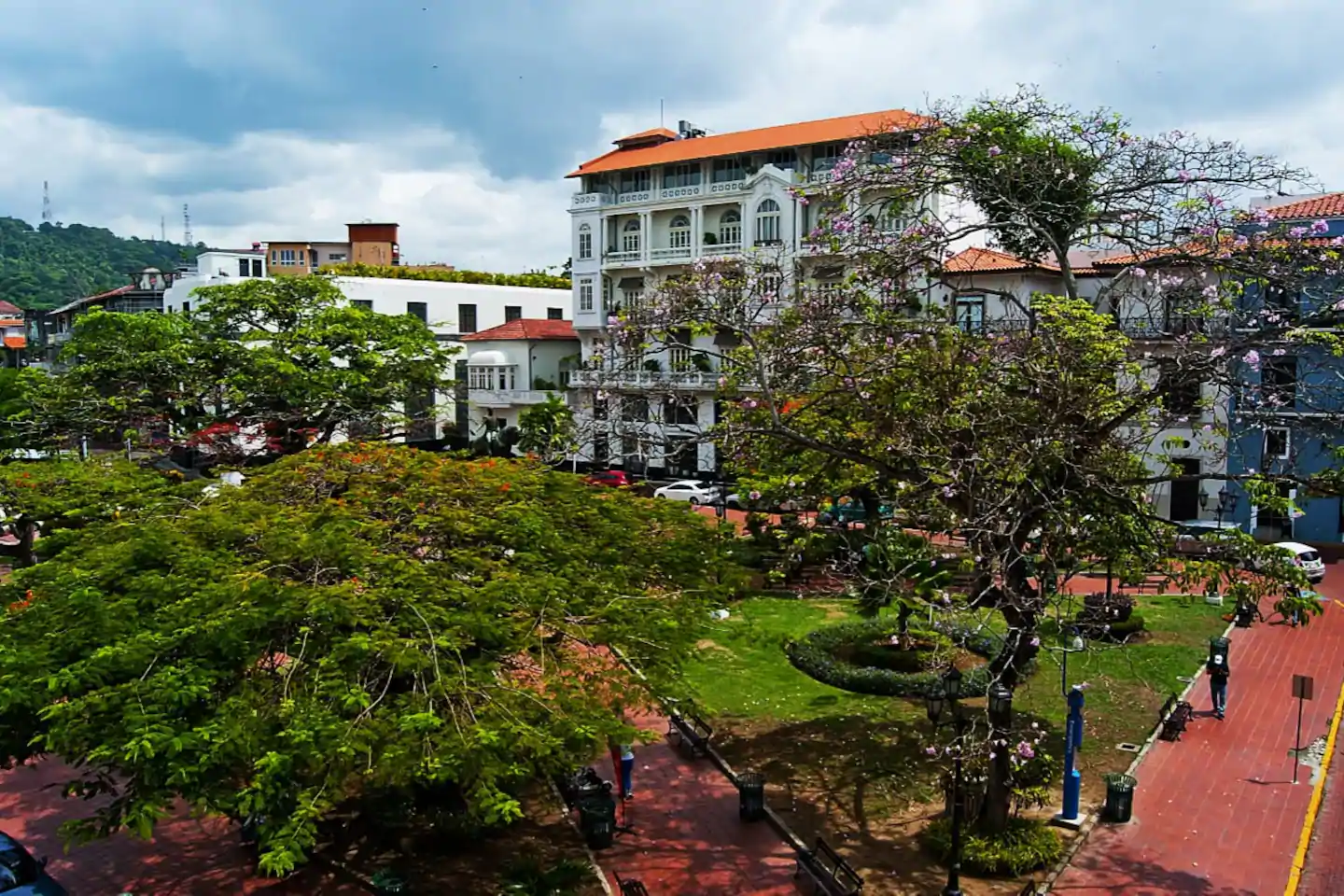 Located right on Plaza Herrera in Casco Viejo opposite the American Trade Hotel you get awesome views of the old town, looking down the cobblestone streets, in addition, to being on a park. You're located next door to Casa Casco rooftop bar/outdoor club, and the Bluemoon Taphouse just to name what is physically next door. This spot is next to bars so that means - keep the party going!